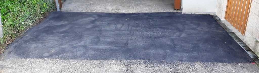 Einen Tag später sande ichs ein. Also Sand in dem Sinn habe ich ja nicht, ich hab ein Restl "No Grow" vom Bauhaus verwendet, das soll das Wchstum von Unkraut in den Fugen verhindern. Da es das bei mir leider nicht tut, kommts auf den Asphalt.