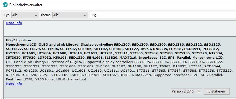 Die Bibliothek von olikraus muß zuvor noch eingebunden werden, macht die Arduino IDE eh scho von selbst, einfach Unter Sketch / Bibliothek einbinden / Bibliotheken verwalten nach 8g2 suchen und installieren.