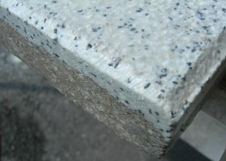 Bei den ganzen Platten geht das Verlegen ja recht geschwind. Da die Platten eine Fase (90 Grad Anschleifung) haben, mache ich das nach einem Schnitt mit der Steintrennmaschine mit der kleinen Flex. 2x drübergefahren und die Fase schaut ganz OK aus.