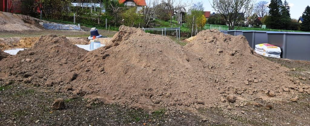 kummt a riesntrumm Lostkroftwogn und Zwickt fost an Kubik Splitt fias Pool und vier Kubik Erdn eini. Und das auf den frischen Grasflaum. Weibi ist verständlicherweise grummelig.