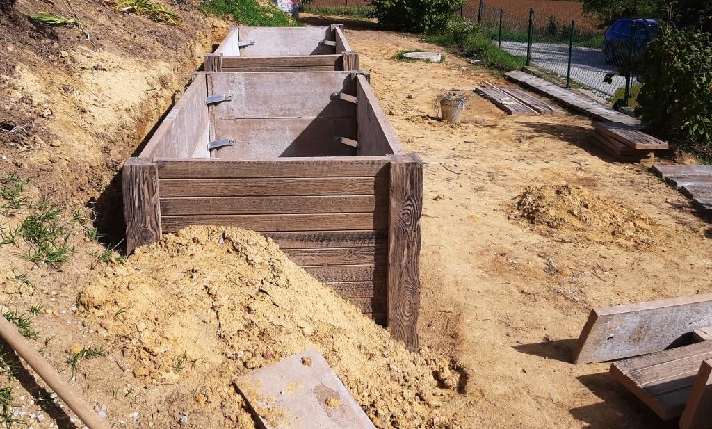 2 Betonhochbeete in Holzoptik sollen südseitig platzsparend in den Hang integriert werden, dazwischen Stufen und paar Gehwegplatten, um auch an die hintere Seite zu kommen.