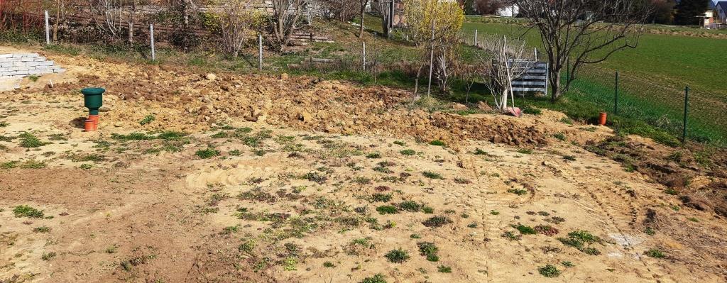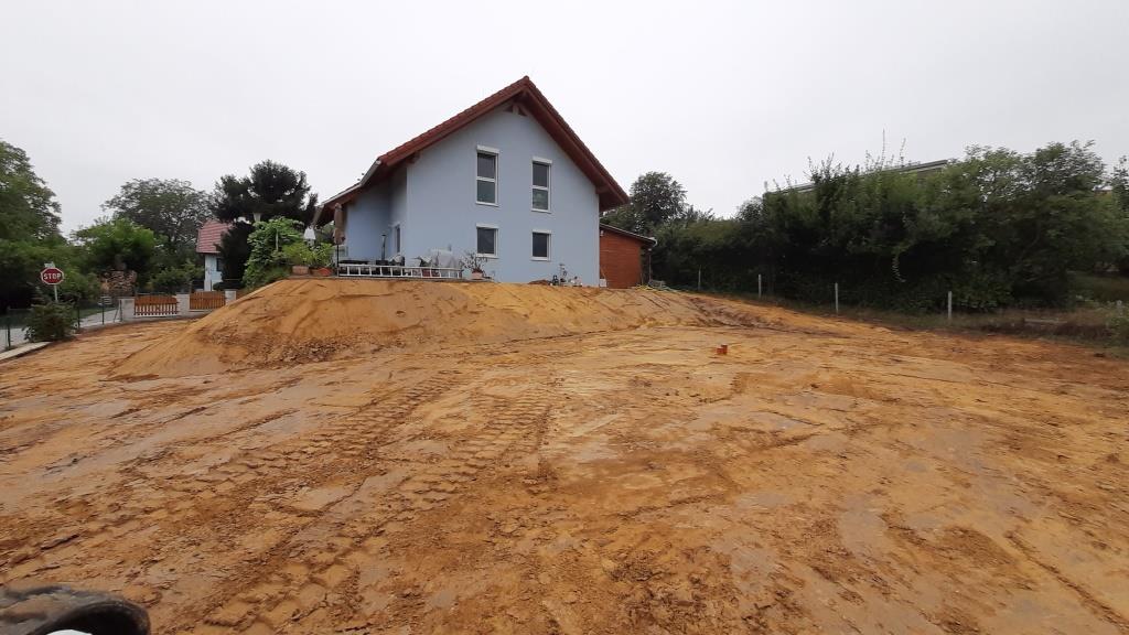 August 2022, nach erfolgreicher Ringgrabenkollektorverlegung haben wir folgende Ausgangsbasis: Der "große" Bagger hat das ganze Gelände schon grob terrassiert und angeordnet, den Feinschliff soll dann der kleine Bagger im Zuge der Gartengestaltung machen.
