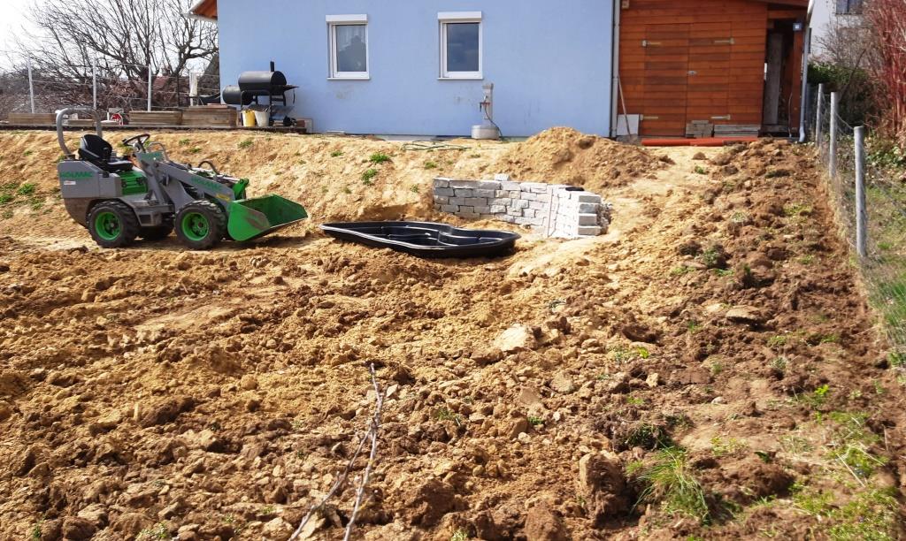 Währenddessen wird schon das Loch vor dem Mäuerl fürs Biotop ausgehoben.