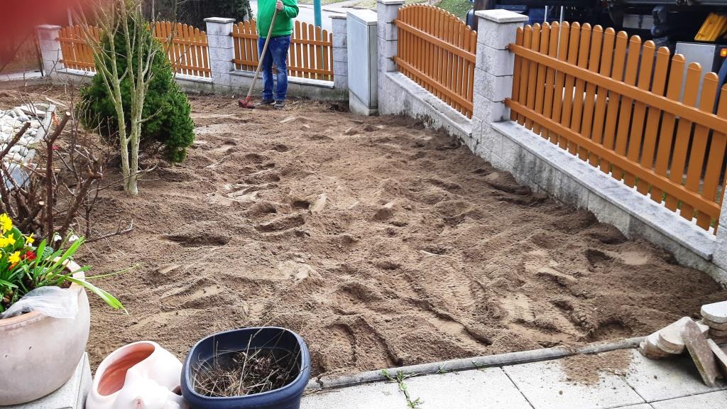 Kraweuschuasta hat im guten Glauben a paar Schauferl Erde auf die nachgegebene Künette schütten lassen, leider ham wir uns grob verschätzt und es war viel zu viel im vorderen Garten. Gehört hätte es schräg vis a vis in den hinteren Garten. Quasi hinter die Mauer.