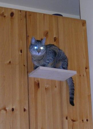 Richtig, die Maus will auch auf den Kasten zu ihrem Körberl und ihrem Futterschüsserl. Aus einem Holzrestl hab ich vor einiger Zeit mithilfe eines alten Farbkübels 2 formschöne Podestln ausgeschnitten und eingeölt. Dazu gibts als Draufgabe noch 2 Vertikalstabilisierungen. Die halten so bombenfest, die könnten sogar den Tiger aushalten. Also theoretisch. Möglicherweise. Glaub ich. Wenn wir die Scharnierln verstärken...