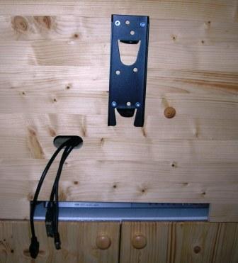 29 Juli 2010 Interessante Arbeit, Teil 2. Fernseher montieren. Eisentrum ausmessen und anschrauben. Habe es sicherheitshalber nicht mit Holzschrauben, sondern mit Maschinenschrauben mit Gegenmuttern montiert, nicht, daß sie noch ausreißen. Dann mit dem Forstnerbohrer 2 Löcher für die Kabeln gebohrt und mit der Stichsäge den Ausschnitt vergrößert.
