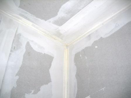 Hier eine Ecke unverspachtelt, Papierbewehrungsstreifen sind schon in die dünne Spachtelmassenschicht reingedrückt.