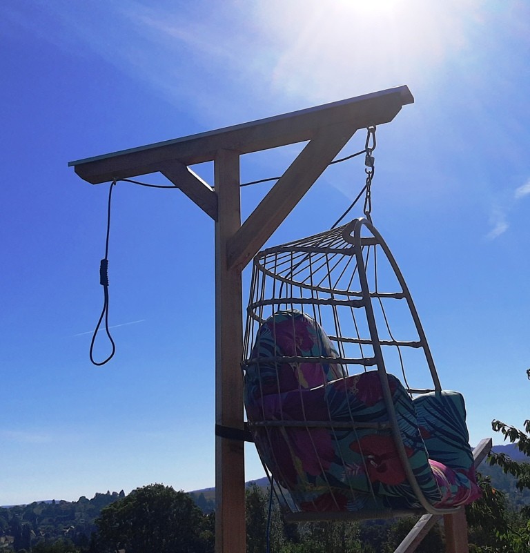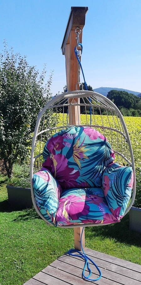 Ende August 2025, endlich ist das Projekt fertig und abgeschlossen. Die Damen haben sich auf einen Hängesessel geeinigt, war gar nicht so einfach, einen Ausgestellten zu finden, Hängesessel gibts fast ausschließlich online. Und Hängesessel ohne Gestell mit dabei gibts gar ned. Das müss ma alt willhabieren.
